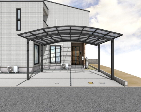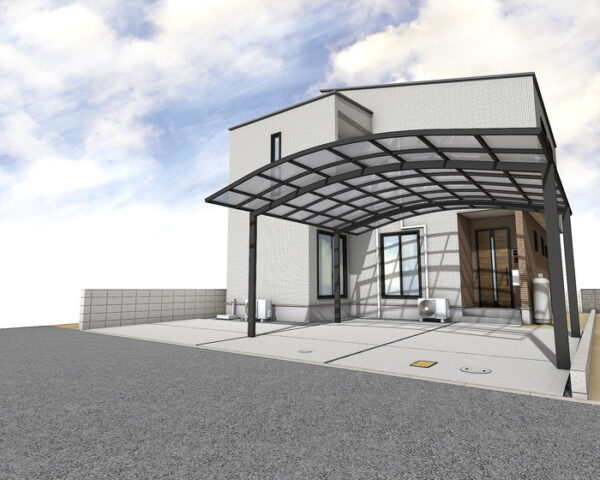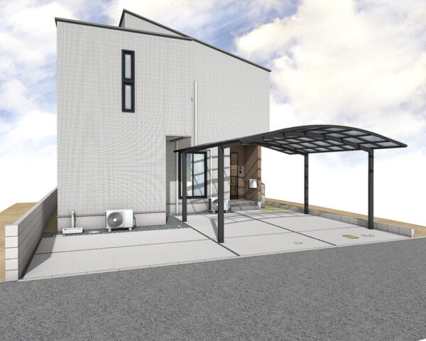 K様邸の駐車スペースには、《YKKap》アリュース 600タイプ 2台用カーポートが愛車を雨風からしっかりと守ります。屋根材はポリカーボネート板(トーメイマット)コンクリート打ち刷毛引き仕上げでデザイン性と滑りにくさを両立。さらに、W70の単粒度砕石を敷いた割溝がアクセントとなり、シャープな印象と高い排水性も確保した、機能的で美しい計画です。