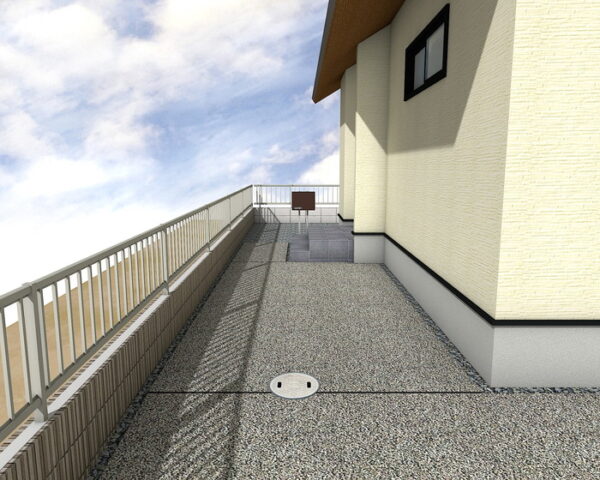 建物周辺には、防草シートと単粒度砕石を敷設し、美しい景観を保ちつつメンテナンスの手間を軽減します。エッジマスターで見切りを設けることで、空間にメリハリが生まれます。将来を見据えたEVコンセントの設置も可能で、機能性と実用性を兼ね備えた外構です。