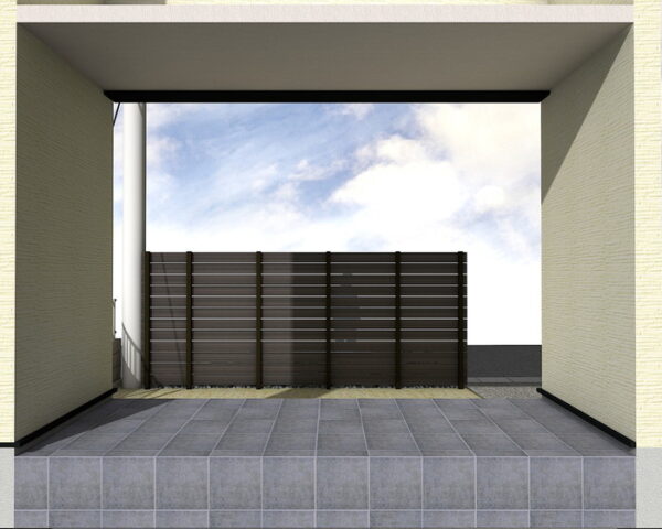 プライベート空間を守るフェンスには、木目調のプラド/oneを採用しています。オークブラックの板材がシックな印象を与え、ダークブロンズの柱と調和します。高さ約2メートルの目隠し効果と、隙間を設けたデザインが風通しと光を取り込み、閉塞感のない快適な外部空間を実現します。