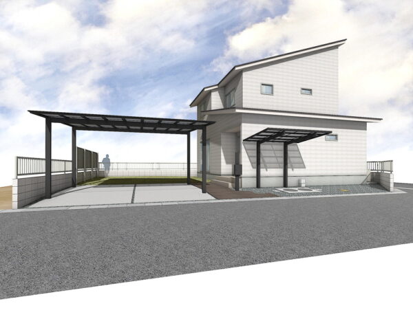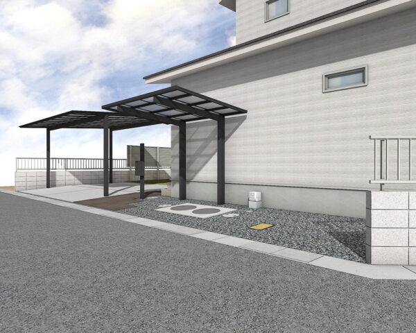 T様邸の駐車スペースには、ネスカ Fの2台用カーポートを設置しました。スタイリッシュなブラックの柱と、光を取り込むクリアマットの屋根材が、車を雨風から守りながらも明るく開放的な印象を創り出します。毎日の車の出し入れが快適で、住まいの顔となるような美しい佇まいを演出するデザインです。