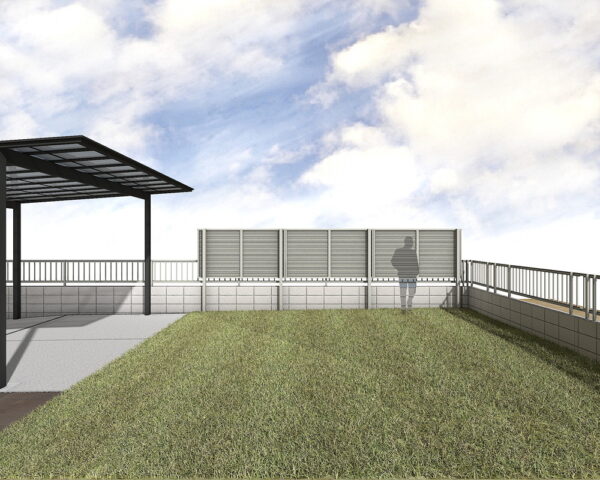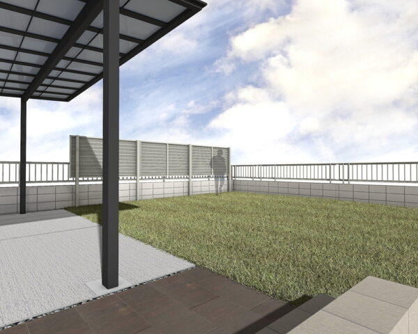 建物周りには、メンテナンスフリーでありながらも、四季を通じて美しい緑を楽しめるクローバーターフ レギュラータイプの人工芝を敷設しました。芝丈30mmのふかふかとした感触が心地よく、ご家族皆様が安心して過ごせるプライベートガーデンを創出します。防草シートと単粒度砕石で雑草対策も万全です。