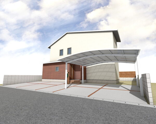 広々とした駐車スペースには、2台用基本のネスカ Rカーポート(54-54型、標準柱H22、ホワイト)を設置しました。屋根材にはポリカーボネート板(クリアマット)を使用し、採光を確保しながらも雨の日も快適な出入りをサポートします。アプローチと統一された刷毛引き仕上げのコンクリート打ちが、一体感のある美しい景観を創り出し、機能性とデザイン性を両立しています。