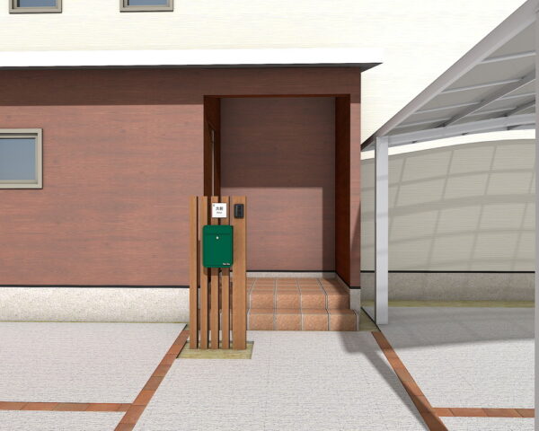 温もりあふれる木調のドレスパーツ 枕木材(70x70、70x130)を組み合わせた門柱は、H≒GL+1500の高さで、訪れる人を優しく迎える住まいの顔となります。可愛らしいアニマルデコの表札(三日月、スモーキーホワイト)と、フォレストグリーンのミルクポスト(前入れ前出し、鍵無し取っ手)が個性と彩りを添え、インターホン子機(施主支給品)もすっきりと収まるよう配慮しました。