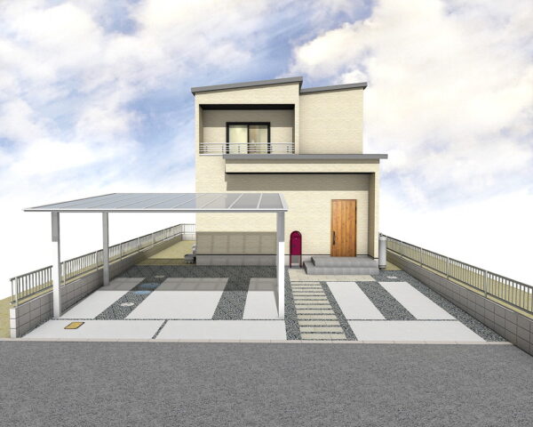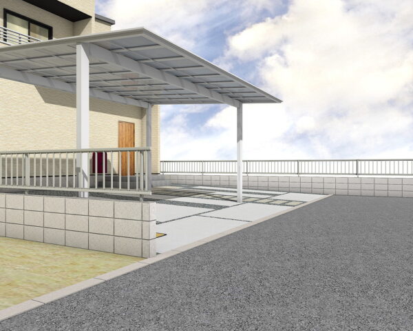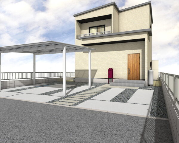 広々とした駐車スペースは、土間コンクリートの鏝押え仕上げで、美しい景観と高い耐久性を両立しています。単粒度砕石の割溝がアクセントとなり、モダンな印象を与えます。車両の出入りがスムーズに行えるよう考慮され、毎日の利便性とデザイン性が兼ね備わった設計です。