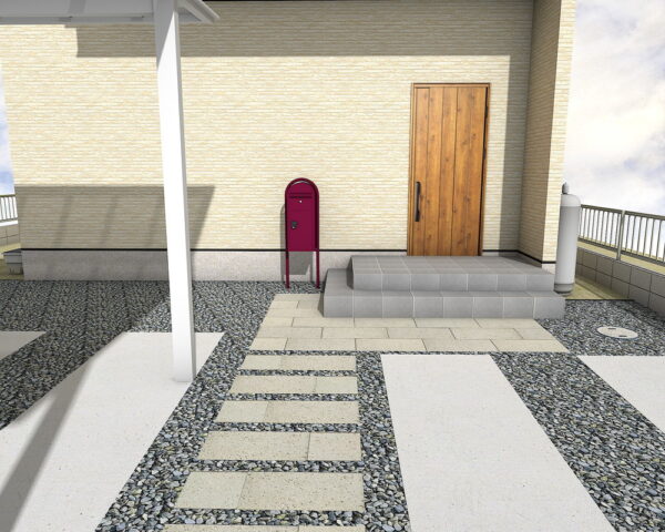 T様邸では、施主様支給の壁付けポストをスマートに設置しています。外観に溶け込むよう計算されたデザインは、住まいの顔として、訪れる方を心地よく迎え入れる洗練されたエントランスを創出します。機能性と美しさを両立した、無駄のない佇まいが魅力です。