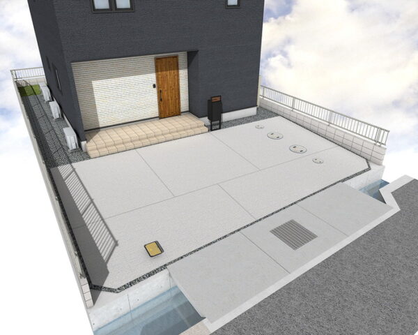 建物周囲には、お手入れが楽な防草シートと単粒度砕石を敷設しました。これにより雑草の繁茂を抑え、常に美しい状態を保ちます。一部には人工芝用下地も確保し、将来的なガーデンデザインの可能性を広げました。手間をかけずに、住まい全体がすっきりと見えるよう配慮した、実用的な空間づくりを実現しています。