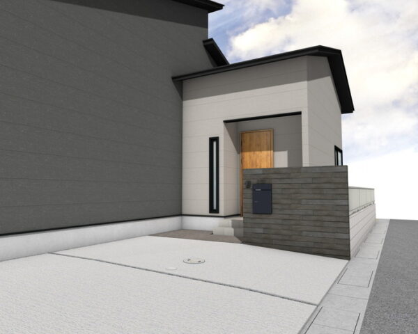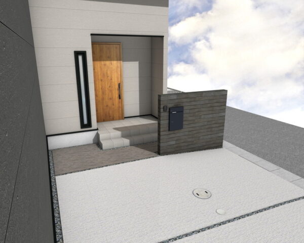 ダークトーンで統一されたダルストーンウォールとキャップが、重厚感と安定感を演出します。マットブラックのシプレ表札とヴィコDB100ポストがシックなアクセントとなり、洗練されたエントランスを形成。郵便物と宅配物をまとめて受け取れる機能性も備え、日々の暮らしにスマートな利便性をもたらします。