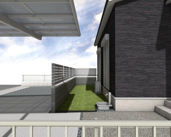 境界には、ダークグレーの塀「トーヨーイースゼロ」を4段積みで設置し、プライベート空間を確保しながらも、重厚でモダンな印象を与えます。フェンスはサンシルバーの「レジリア YK3型」フリー支柱タイプを採用し、建物との調和を図りつつ、開放感と安全性を両立。デザイン性の高い塀とフェンスが、住まい全体を引き締めます。