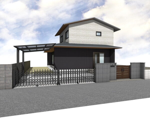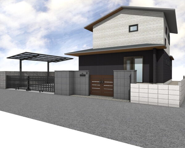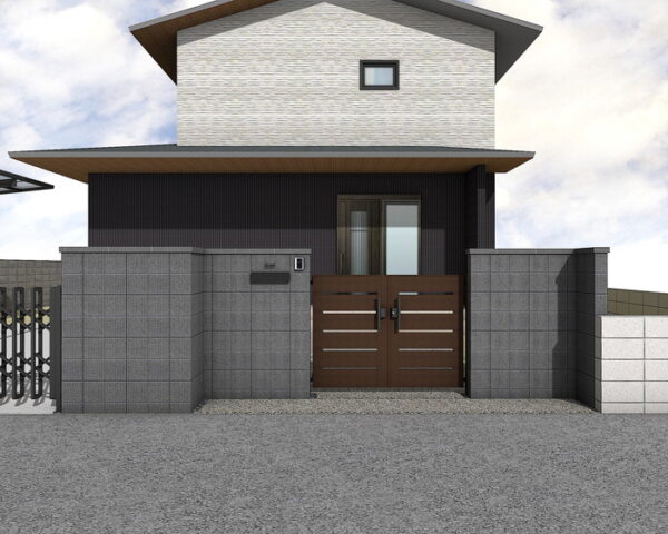 化粧ブロックの門柱はダークグレーで重厚感を演出し、モードブラウンのスリムキャップSが洗練されたアクセントとなります。使い勝手の良いエメールポストを組み込み、ルシアス門扉はショコラウォールナットの扉とカームブラックの門柱が織りなすコントラストが、訪れる方を優雅に迎える邸宅の顔を創り出します。