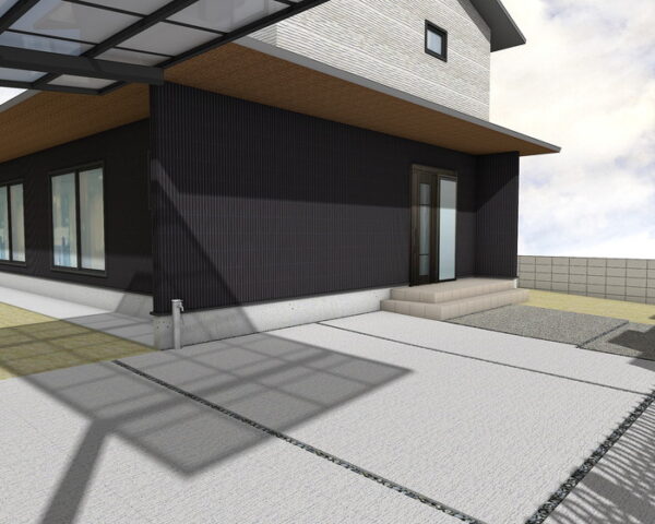 洗い出し仕上げのジャミコンクリートと単粒度砕石の割溝が、歩くたびに表情を変える美しいアプローチをデザインします。自然な風合いとモダンなラインが融合し、玄関へと続く道のりを特別感のある空間へと昇華させます。日々の動線に彩りを加える計画です。