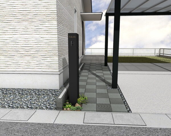 「機能門柱FT」は、マットブラックが際立つモダンな佇まいです。宅配ボックスが内蔵されているため、日々の荷物の受け取りもスムーズに行えます。ゴールドの「切り文字サイン slimA」が、洗練されたエントランスを演出し、機能性とデザインが見事に調和した、T様邸の顔となる門柱です。