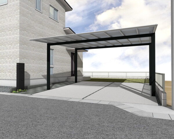 開放感あふれる「スカイリード」のカーポートは、両側支持タイプで広々とした駐車空間を確保します。屋根材にはかすみ調のポリカーボネート板を採用し、明るさを保ちつつ適度なプライバシーを守ります。刷毛引き仕上げのコンクリート土間と割溝で、シンプルかつ機能的な駐車スペースが完成しました。