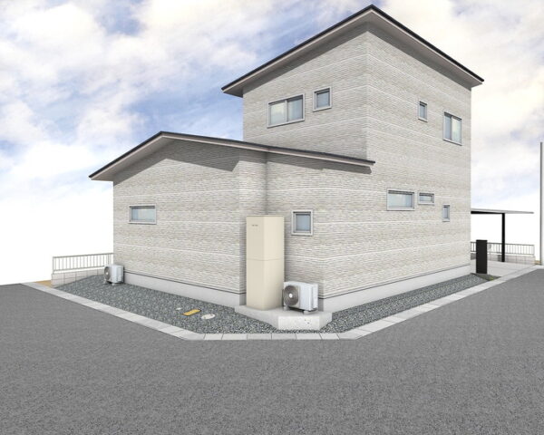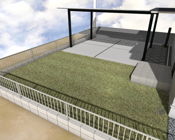 建物周りには、メンテナンスフリーで一年中美しい緑を保つ「クローバーターフ」の人工芝を敷設しました。芝丈30mmのレギュラータイプが自然な風合いを演出し、見切りには「エッジマスター」を使用してすっきりとした仕上がりです。防草シートと単粒度砕石敷きで、手入れの手間を軽減しています。