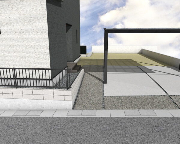 玄関へと続くアプローチは、ジャミコンクリートの洗い出し仕上げで、自然石のような豊かな表情を演出しました。割溝に敷き詰めた単粒度砕石がデザインのアクセントとなり、住まいの顔として訪れる人を優雅にお迎えする、洗練された空間を創り出しています。