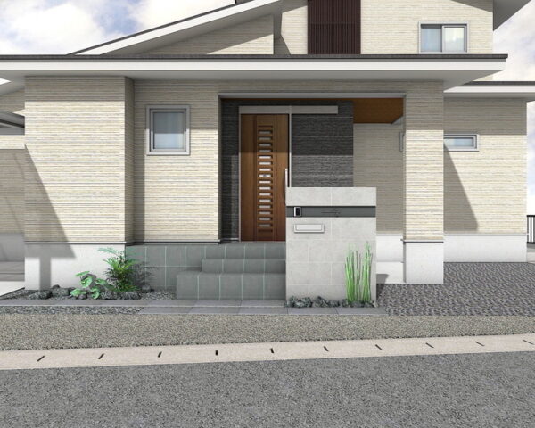 玄関へ続くアプローチは、ジャミコンクリートの洗い出し仕上げで、自然石の風合いと滑りにくさを両立します。単粒度砕石を敷き詰めた割溝がデザインのアクセントとなり、歩くたびに豊かな表情を見せ、心地よい足元を演出します。