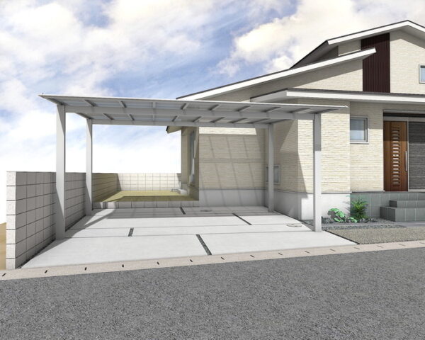 駐車スペースには、両側支持タイプのカーポート「スカイリード」を設置し、大切な車を日差しから守ります。熱線遮断ポリカーボネート板の屋根材が快適性を保ち、コンクリートの土間仕上げは機能的かつ美しい景観を実現しました。