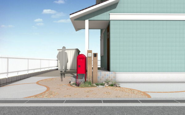 Y様邸のアプローチは、ライトイエローの玉砂利洗い出し仕上げが明るく開放的な印象です。アンチックカラーのソイルレンガピンコロを鮮やかに配し、歩くたびに楽しいリズムを演出。アンチックオレンジの縁取りレンガが全体を引き締め、統一感ある美しいエントランス空間を創り上げました。
