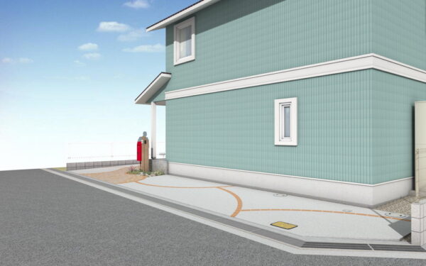 Y様邸の駐車スペースは、土間コンクリートを刷毛引き仕上げで施し、滑りにくく安全な機能性を持たせました。スリットにはアンチックオレンジのソイルレンガを挿入し、実用性の中にデザイン性をプラス。機能的でありながら、美しい仕上がりが魅力の駐車スペースです。