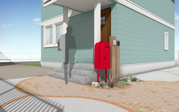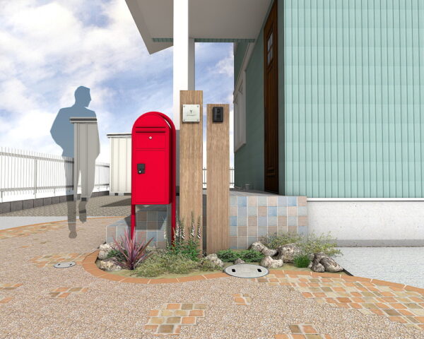 Y様邸の門柱は、温もりあるヴィンテージウッド スリーパーラフトが印象的です。深みあるナッツ色が風格を演出し、レッドの宅配ポスト ボビカーゴが鮮やかなアクセントに。足元には大窪石の割栗石を据え、自然な表情をプラス。機能性と美しさを兼ね備えた、住まいの顔となるデザインです。