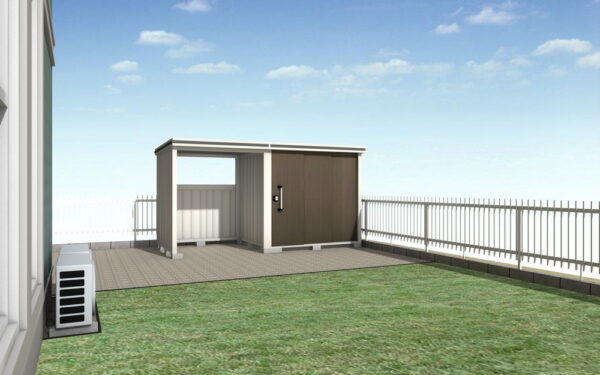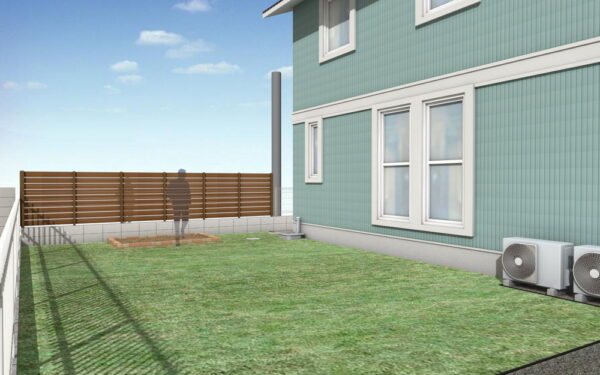 Y様邸の庭は、美しい人工芝敷設で一年中手入れいらずの快適さを実現。防草シートと化粧砂利敷きで管理も楽に。物置エルモコンビも完備し、機能性と美しさを両立した、日々の暮らしをサポートする快適な空間です。