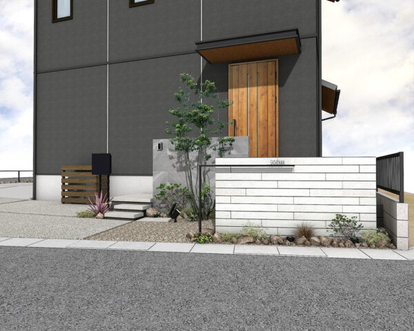 隣地との境界には、デザイン性とプライバシー保護を両立した境界塀とフェンスを設置しました。シンプレオフェンスとフェンスALの組み合わせは、重厚感を保ちつつも開放的な印象を与えます。足元には大窪石の割栗石を据え付け、自然な表情を添えることで、周囲の環境と調和した美しい外観を演出します。