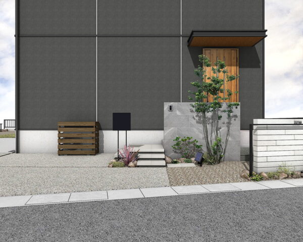 深みのあるディープグレーのタイル門柱と、プレミアムホワイトのスレンダーウォール袖壁が織りなす洗練されたエントランス。直線的なデザインに、シンプルフレームの表札とスタイリッシュなポストが映えます。軽やかなキャンティ仕様のドゥー・ステップは、訪れる人を心地よく邸宅へ誘い、格調高い空間を演出します。