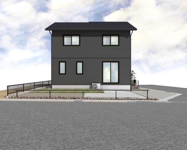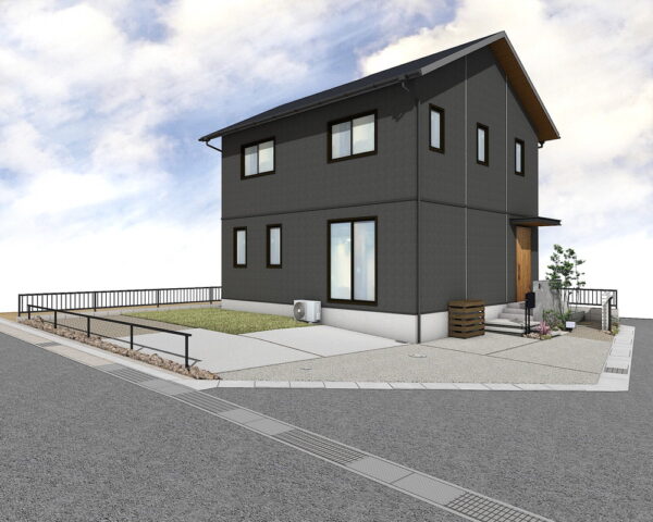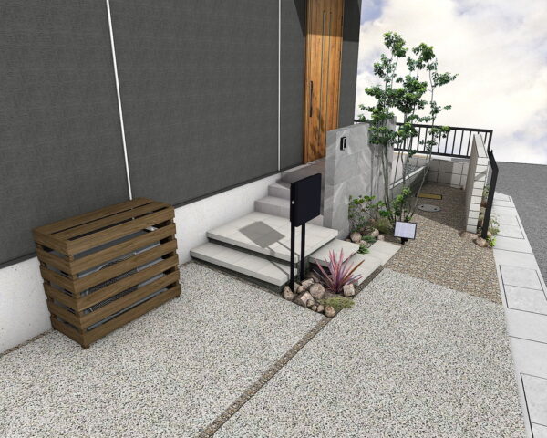 建物周りには、メンテナンスの手間を軽減する防草シートの上に化粧砂利や単粒度砕石を敷き詰め、常に清潔で美しい景観を保ちます。一部には施主様こだわりの人工芝をエッジマスターで見切り、緑豊かな安らぎの空間を創出。実用的な室外機カバーも考慮し、機能的で心地よい裏動線をデザインしました。