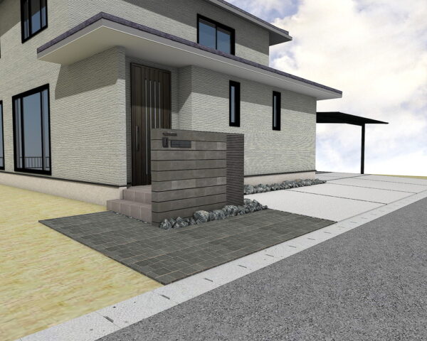 K様邸のアプローチには、落ち着いたポルドグレーのポルドブリックを配置しました。建物や周囲の環境と美しく調和する色合いが、玄関へと続く道のりを上品に彩ります。足元に広がる美しい石張りが心地よいリズムを生み出し、訪れる人々に洗練された第一印象と安心感を提供します。