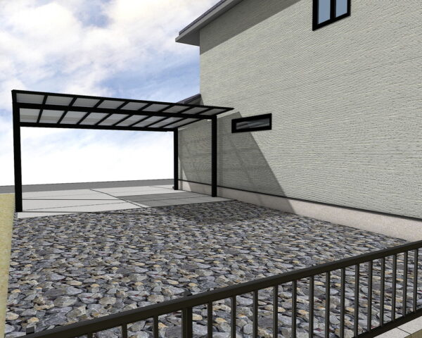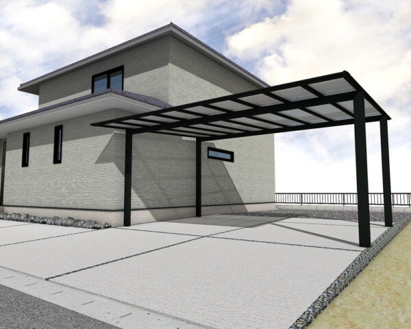 K様邸の駐車スペースには、熱線遮断ポリカーボネート板のカーポートを設置しました。強い日差しを和らげ、車内温度の上昇を抑制し、快適な乗り降りをサポートします。刷毛引き仕上げの土間コンクリートは、安全性と同時に洗練された印象を与え、割溝と単粒度砕石、割栗石が空間に奥行きと上質感を加えます。