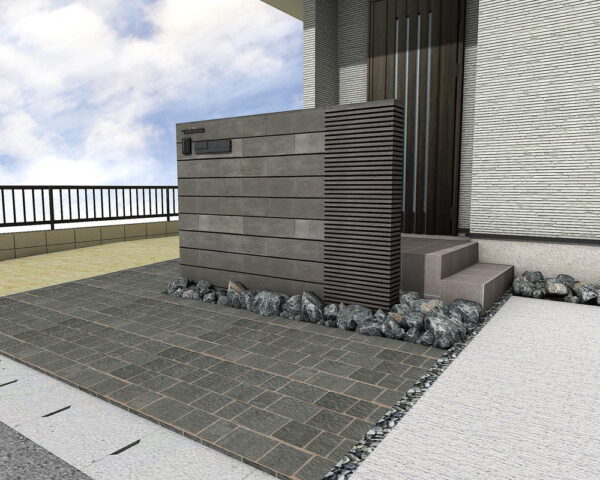 K様邸の門柱は、異なる積み方のダルストールウォールとラインウォールを組み合わせ、モダンで重厚な印象を与えます。ダークとクロウの色合いが空間に深みを加え、上質なダルストーンキャップの笠木が風格を添えます。アピアの表札とモデルノW 横型 デコのポストは機能性とデザインを両立し、訪れる人をスマートに迎え入れる佇まいを創出します。