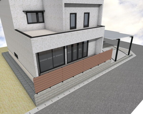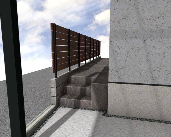 「トーヨーイース ゼロ」の境界塀は、シンプルながらも重厚感のあるライトグレーで、敷地をしっかりと区画します。再生木板を使用した目隠しフェンスは、プライバシー保護と開放感を両立し、ブラウンの木目調とマットブラックのアルミ柱が、スタイリッシュな外観を演出します。