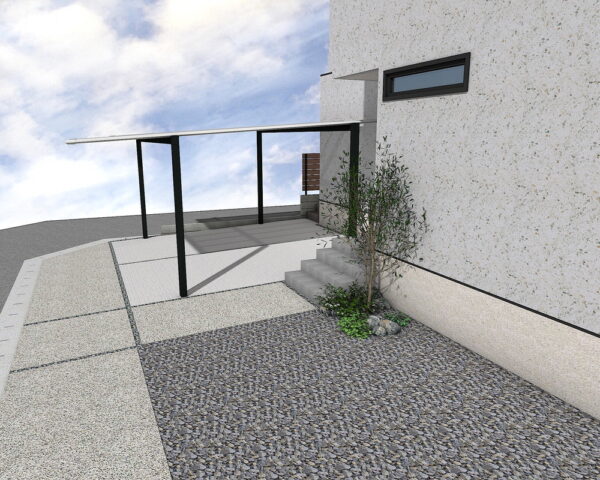 建物に寄り添うように配置されたタイルデッキ「ピエトラクォーツ」は、上品な石目調のデザインが外観に高級感を添え、室内から庭へのスムーズな動線を創出します。防草シートと単粒度砕石の敷設により、メンテナンスの手間を軽減しながら、常に美しい建物の足元を保つ工夫が凝らされています。