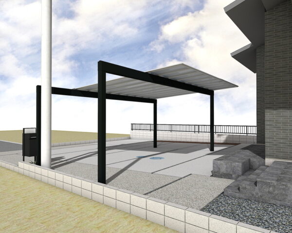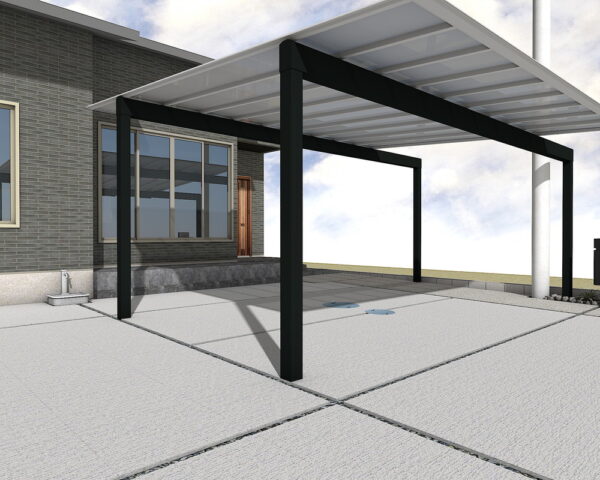 K様邸の駐車スペースには、スカイリードのカーポートを設置。梁の延長加工や切り詰め加工を施すことで、敷地の形状に合わせた柔軟な設計を実現しました。ポリカーボネート板の屋根材が光を優しく通しつつ、愛車を雨風から守ります。機能性とデザイン性を兼ね備え、毎日の車の出し入れを快適にする空間です。