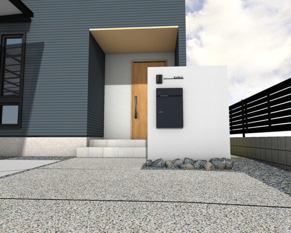建物に調和する高さ1500mmの門柱は、美ブロシルキーHGの塗り仕上げで洗練された印象です。マットブラックのシプレワイド表札と埋込型ヴィコDB 100ポストがスマートな顔立ちを演出し、ダイヤル錠と宅配ボックスで機能性も確保。足元に配した割栗石が自然なアクセントとなり、K様邸の個性を引き立てます。