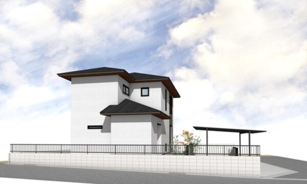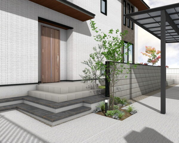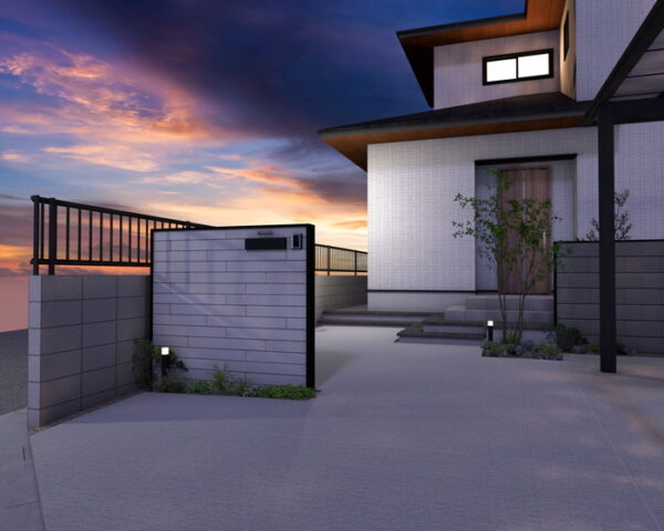 敷地の境界には、ライトグレーの化粧ブロックトーヨーイース ゼロを積み上げた土留を設置。既存のブロック塀とも調和し、安全で美しい境界線を創出します。シンプレオフェンスがプライバシーを守りながらも、開放感を損なわない配慮がされています。