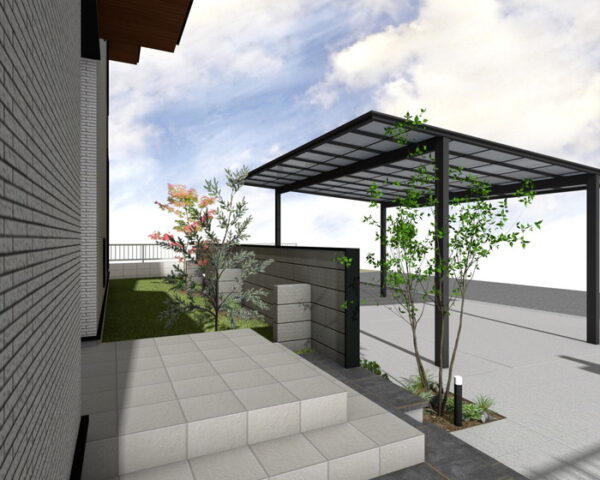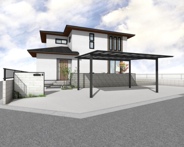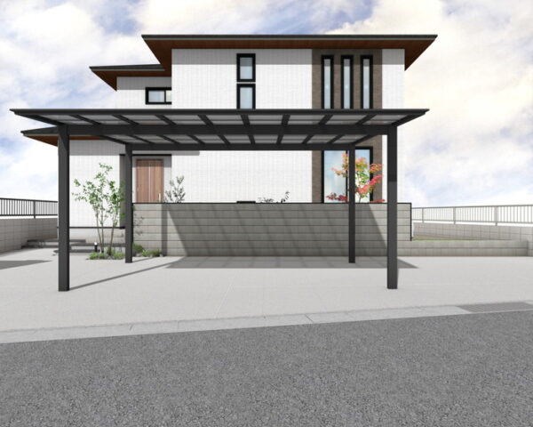 大切な愛車を守る駐車スペースには、2台用カーポートのネスカFを設置しました。クリアマットの屋根材が光を取り込み、明るい空間を保ちます。土間はコンクリート打ちの刷毛引き仕上げで滑りにくく、沼田(みかげ)化粧砂利の割溝とエキスパンタイがデザインのアクセントです。