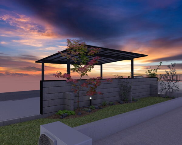 夜のエクステリアを彩る照明計画として、丸形透過型のローポールライトを効果的に配置しました。門柱前や植栽エリアを優しく照らし、住まいの魅力を一層引き立てます。安全性を高めつつ、幻想的な雰囲気でナイトガーデンを演出します。