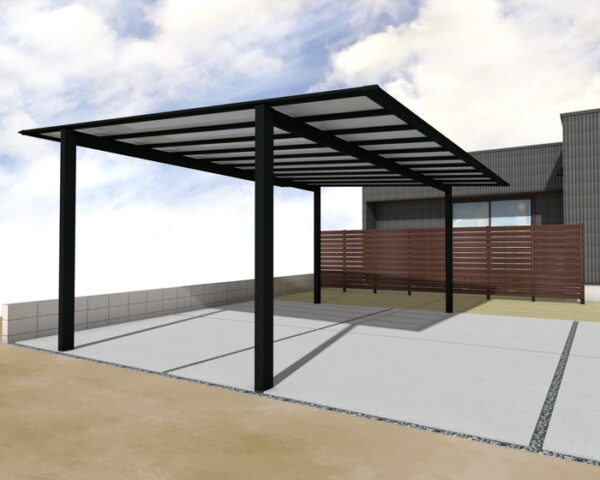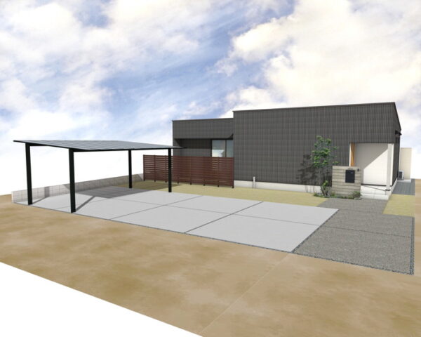 広々とした駐車スペースには、スカイリード 両側支持タイプを設置。車をしっかりと守りながら、開放感を損ないません。屋根材のかすみ調ポリカーボネート板が、優しい光を取り込みます。土間はコンクリート鏝押え仕上げで耐久性も高く、美しい割溝と単粒度砕石敷きがスマートな印象を与えます。