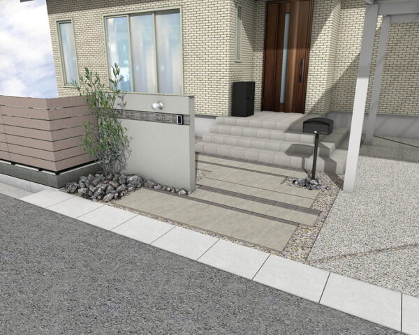 ウォームグレーとダークグレーのエクレルで美しいグラデーションを表現したY様邸のアプローチ。ロッソ色のヴィンテージウッドスリーパーペイブが温かみを添え、化粧砂利の割溝が足元にリズムを生みます。多彩な素材の組み合わせが、機能性と視覚的な美しさを両立した空間です。