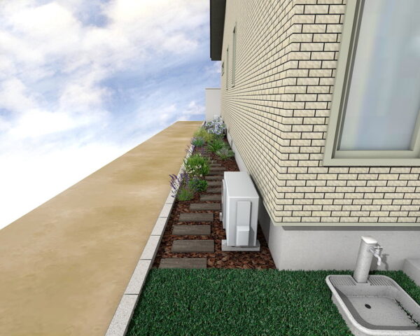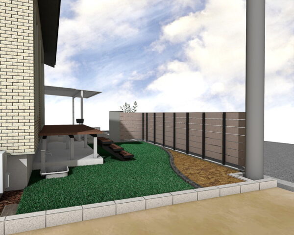 Y様邸の建物周りには、クローバーターフ人工芝が広がり、手軽に緑豊かな空間を実現。ヴィラウッドウッドデッキは独立ステップで庭とのつながりをスムーズにし、屋外でのくつろぎを提供。菜園スペースも見切り材で区画し、防草シートと化粧砂利で管理の手間を軽減。自然の温もりと機能性を兼ね備えた癒しの空間です。