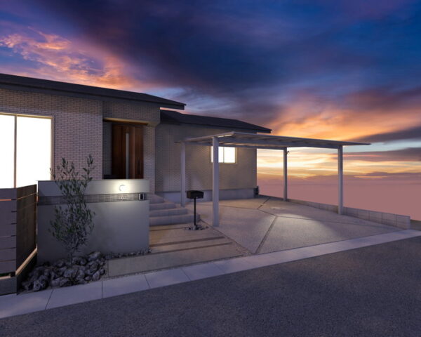 Y様邸の照明は、夜の住まいに奥行きと安心感を。門柱の真鍮製ガーデンライトBH1000が温かくエントランスを照らし、カーポートのFreePaセンサー付きLEDスポットライトは必要な時だけ自動点灯。機能性とデザイン性を両立し、帰宅を優しく迎え、美しい夜景を創出します。