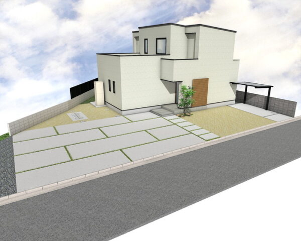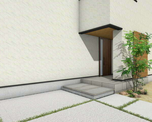 M様邸のアプローチは、コンクリートと高品質なクローバーターフ人工芝の組み合わせが特長です。美しい割溝がアクセントとなり、心地よい空間を演出します。段差にはニュートペイブのステップが軽やかに浮遊するキャンティ仕様で、デザイン性と機能性を兼ね備えた、お客様を優雅に迎える玄関周りを実現しました。