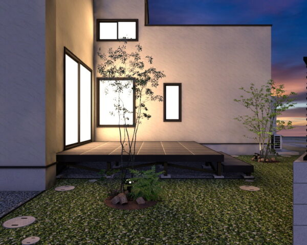 広々としたタイルデッキは、3.6m四方のゆとりの空間。グレーのタイルとブラックのアルミ幕板がモダンな印象を与え、開放的なアウトドアリビングとして活用できます。オプションのステップも設置され、庭へのスムーズな動線も確保。家族や友人と過ごす豊かな時間を生み出す、特別な場所を提案しました。