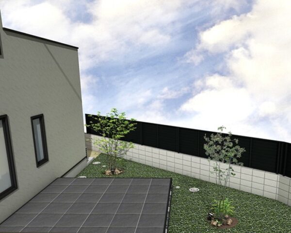 境界部分では、既存擁壁の調整に加え、上部に5段積みのブロックと堅牢なレジリアフェンスを設置しました。モダンなブラックのフェンスはプライバシーを確保しつつ、周囲の景観と調和し洗練された印象を与えます。安全性を高めながら、住まいの外観を一層引き立てる堅実な境界デザインです。