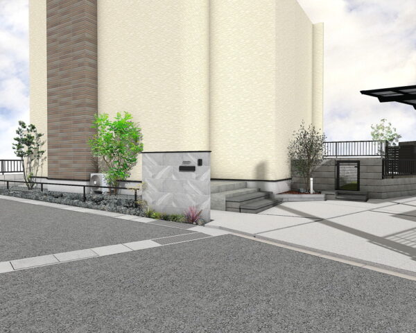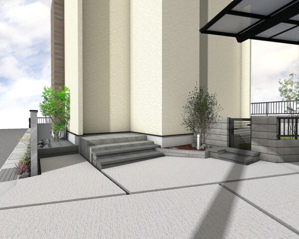 玄関へ導くステップは、ライトグレーのトーヨーイースゼロとダークグレーのドゥー・ステップで構成。キャンティ仕様で軽やかさを出し、アプローチにリズムと奥行きを与えます。周囲のシンプレオ門扉や塀との調和を図りながら、安全かつ美しく邸宅へ誘う設計。使い勝手とデザイン性を両立しました。