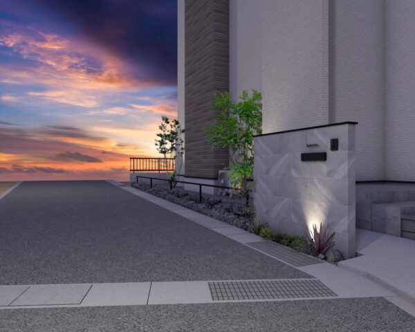 K様邸の門周りは、深みのあるディープグレーのアヴェルサ門柱が風格を演出します。ブラックの笠木と一体感を持たせ、シプレ表札やエメールポストも同色で統一。電球色のガーデンアップライト ミオが優しく照らし、夜間も上品な表情を保ちます。訪れる人々を温かく迎え入れる、洗練された門周りです。