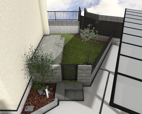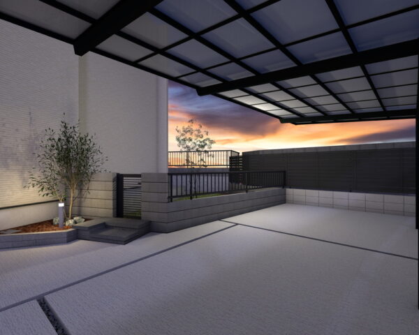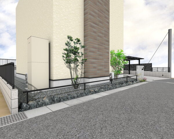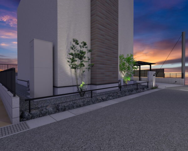 建物周辺は、芝丈30mmのクローバーターフ レギュラータイプ人工芝で年間を通して緑豊かな空間を実現。手入れの手間を減らしつつ、常に美しい景観を楽しめます。一部にはスレンダーウォールで花壇を設け、ポールライトが夜の表情を豊かに演出。防草シートと単粒度砕石敷きで、雑草対策も万全です。