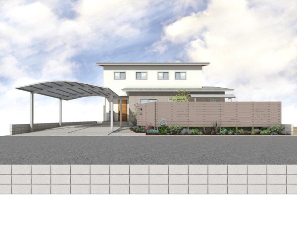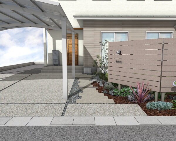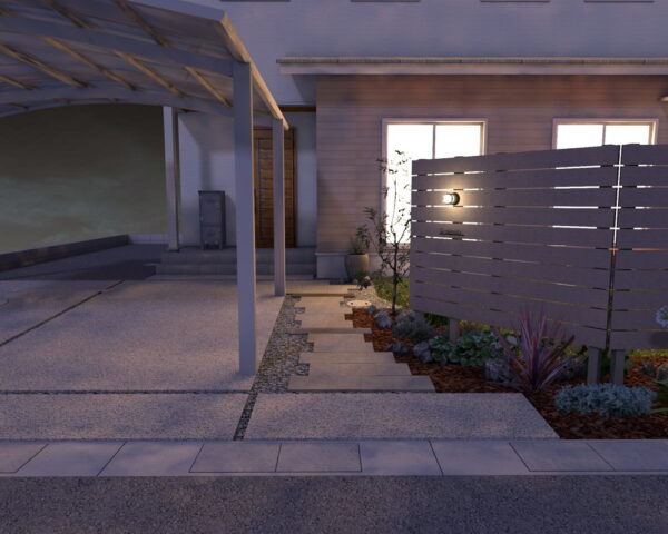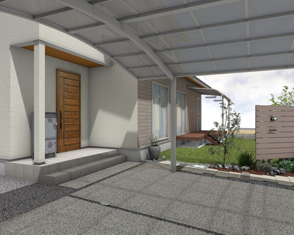 U様邸の駐車スペースは、機能性と美しさを追求しました。二台用のカムフィエースワイドカーポートが、大切な愛車を雨や日差しから守ります。熱線遮断ポリカーボネート板の屋根材が、夏場の車内温度上昇を抑えます。土間はジャミコンクリート打ちの洗い出し仕上げで、足元には単粒度砕石の割溝がデザインのアクセントとなり、実用性と景観を両立しています。