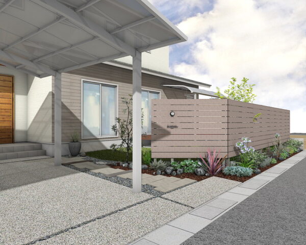 U様邸の境界周りには、プライバシーとデザイン性を両立したフェンスを設置しました。グレージュカラーのエコモックフェンスは、再生木板を使用し、H2000の高さと10mmの隙間で視線を程よく遮りながらも、圧迫感を与えません。隣地との緩やかな境界を作り出し、住まいの安心感を高め、穏やかな佇まいを演出します。