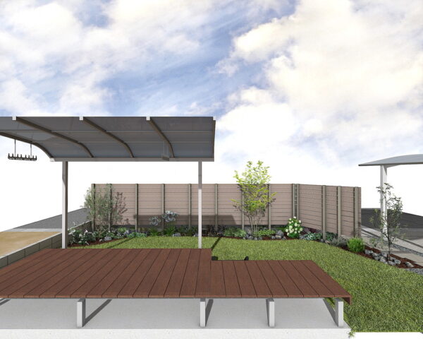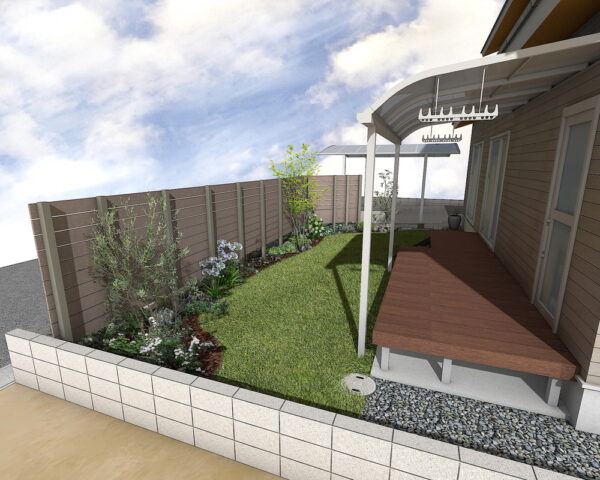 U様邸の建物周りは、使い勝手と美観を兼ね備えました。土間はコンクリート打ちの鏝押え仕上げで、安定した通路と空間を提供します。一部には、メンテナンスフリーのクローバーターフレギュラータイプ人工芝を敷設。一年中美しい緑が保たれ、お子様やペットが安心して遊べる安全なスペースを創出しました。管理の手間を軽減し、暮らしにゆとりをもたらします。